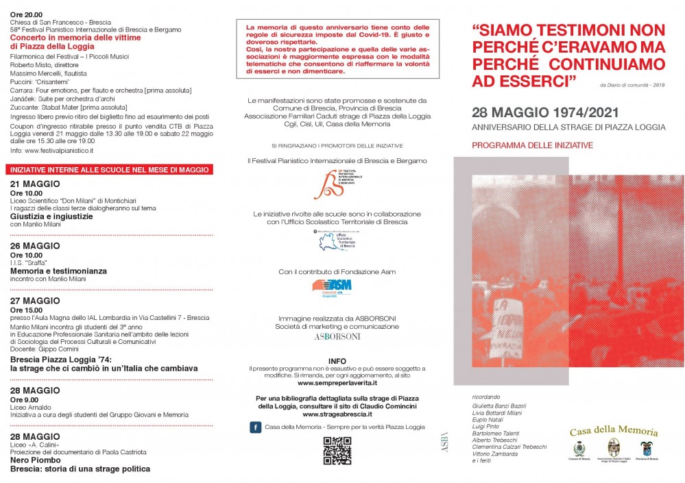 Si segnala che il concerto per le vittime di piazza della Loggia organizzato dal Festival Pianistico Internazionale nella chiesa di S. Francesco per il 28 maggio 2021, alle ore 20 (ingresso gratuito con coupon ritirabile presso il punto vendita venerdi 21 maggio 13.30-19 e sabato 22 maggio 15.30-19).
